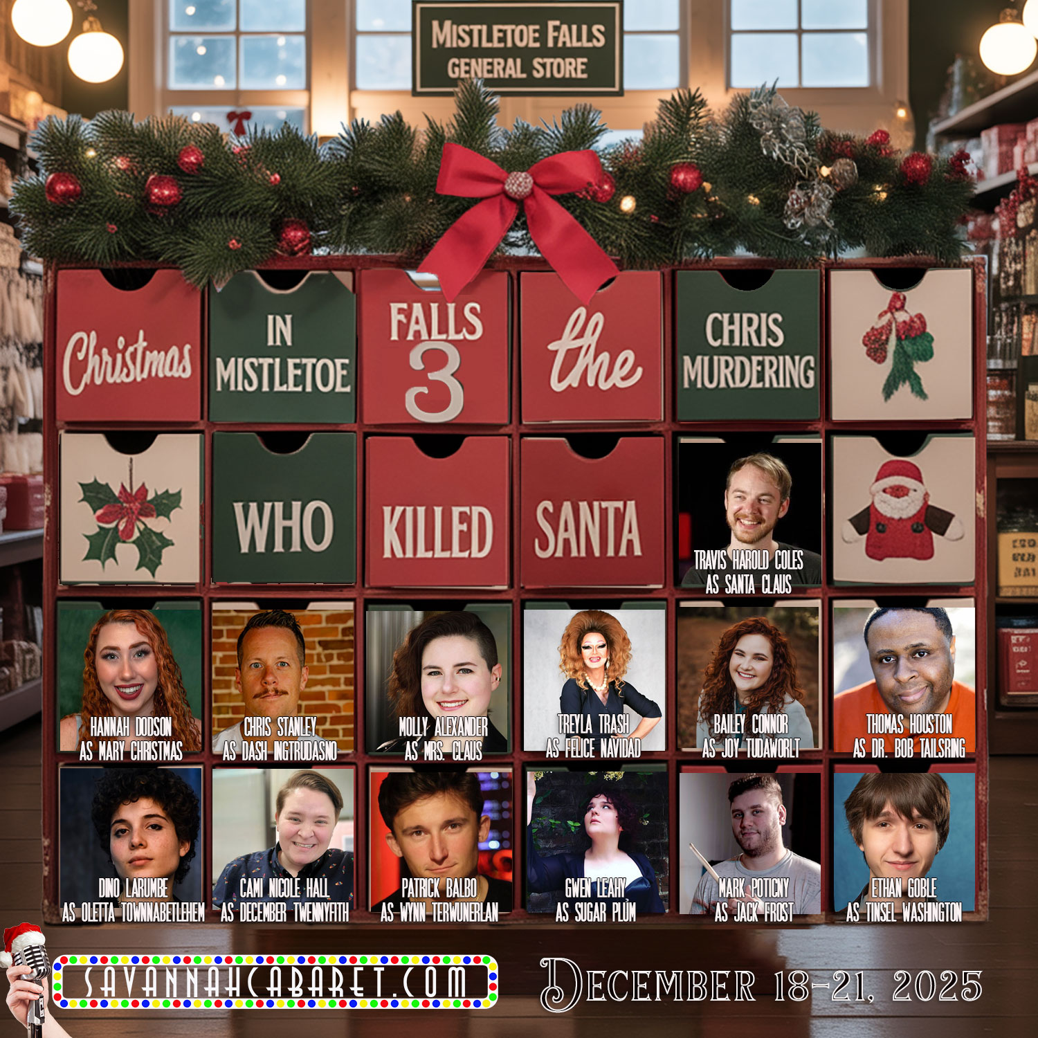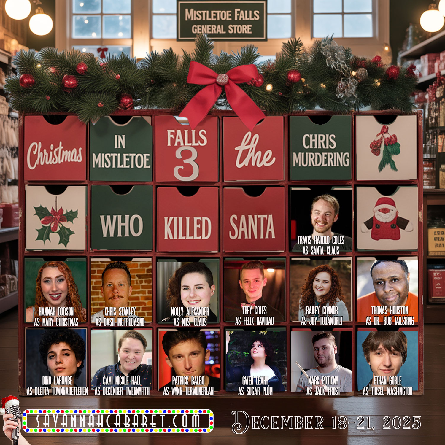 SHOW NOTES: “Chirstmas in Mistletoe Falls 3: The Chrismurdering” contains adult language, simulated violence, and sometimes scantily dressed actors making fools of themselves. Guests must be 21 years of age or older at all performances and the show is for immaturely mature audiences only. Please be aware the theater is on the second floor and is only accessible by stairs; no elevator is available.